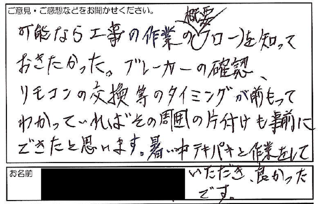 - 商品を交換させていただき、試運転を行ったら工事完了です。後払いのお客様は工事後にお支払いをしていただく流れとなります。